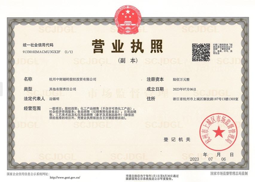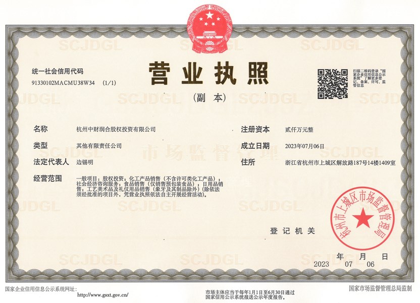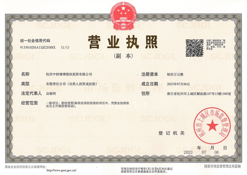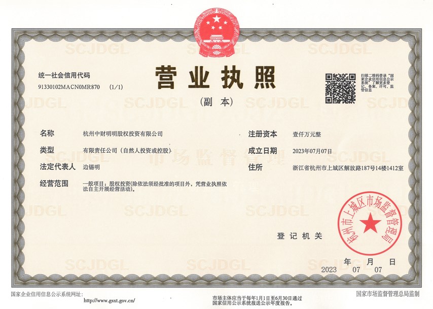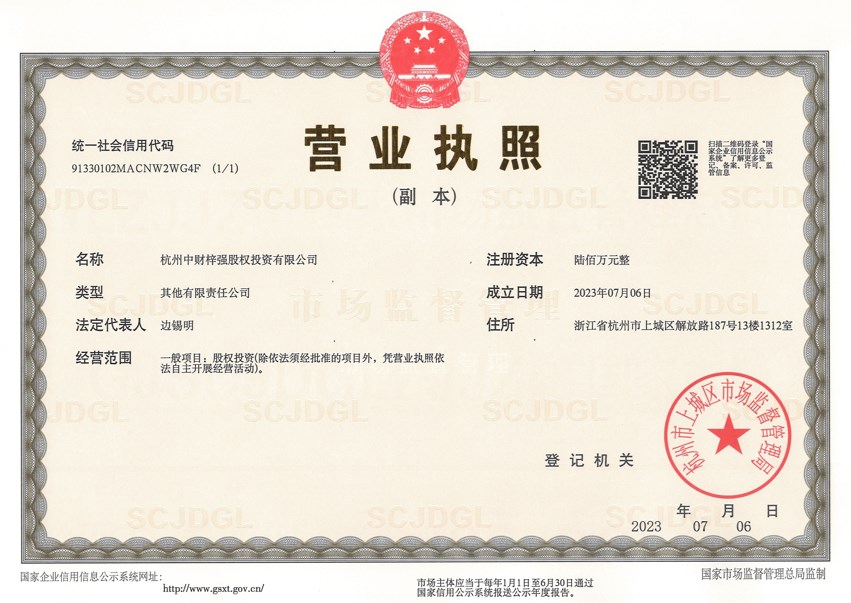中財訊 根據中財董局字[Ⅷ]第6號之文件精神,為進一步壯大中財投資事業,全面構建中財投資十一條大街,在集團首席投資官、集團常務副總裁、集團執行總裁(資本)的組織籌建及各級領導的通力支持下,杭州中財北冥股權投資有限公司、杭州中財挺進股權投資有限公司,杭州中財嘯博股權投資有限公司、杭州中財梓強股權投資有限公司、杭州中財潤合股權投資有限公司、杭州中財明明股權投資有限公司,杭州中財越嶺股權投資有限公司等七家公司已于2023年7月7日領取營業執照,正式成立。