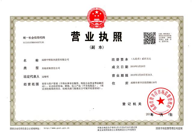 中財訊 在集團領導的大力支持和相關部門的通力配合下,成都中財陳風投資有限公司于2019年3月22日正式領取營業執照。 成都中財陳風投資有限公司將秉承中財集團一貫的“誠實、認真、謙讓”精神,立志成為能發揚中財風格、形成自我特色的專業投資者;肩負中財資產增值...